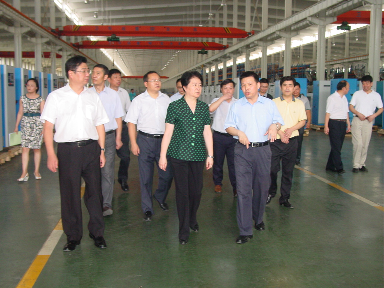 圖一張岱梨(左二),在天門市委書記柯?。ㄗ笠唬┑仁蓄I(lǐng)導(dǎo)和天門紡機公司董事長沈方勇(右一)等公司領(lǐng)導(dǎo)的陪同下,在天門紡機板件車間視察的場景。