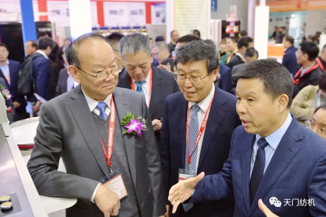 沈方勇董事長在2019年上海國際紡機展上,向中國紡聯(lián)黨委書記兼秘書長高勇等領(lǐng)導介紹天門紡機新產(chǎn)品開發(fā)情況