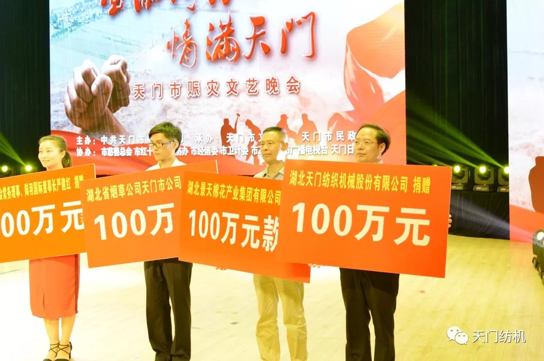 2016年,天門全市遭遇百年一遇的特大洪澇災(zāi)害,人民生命財產(chǎn)受到嚴(yán)重威脅。天門紡機積極參與政府組織的抗洪救災(zāi)慰問活動,為奮戰(zhàn)在一線的防汛抗災(zāi)人員送去食品、藥品和救災(zāi)物資,并捐贈100萬元抗洪救災(zāi)款。