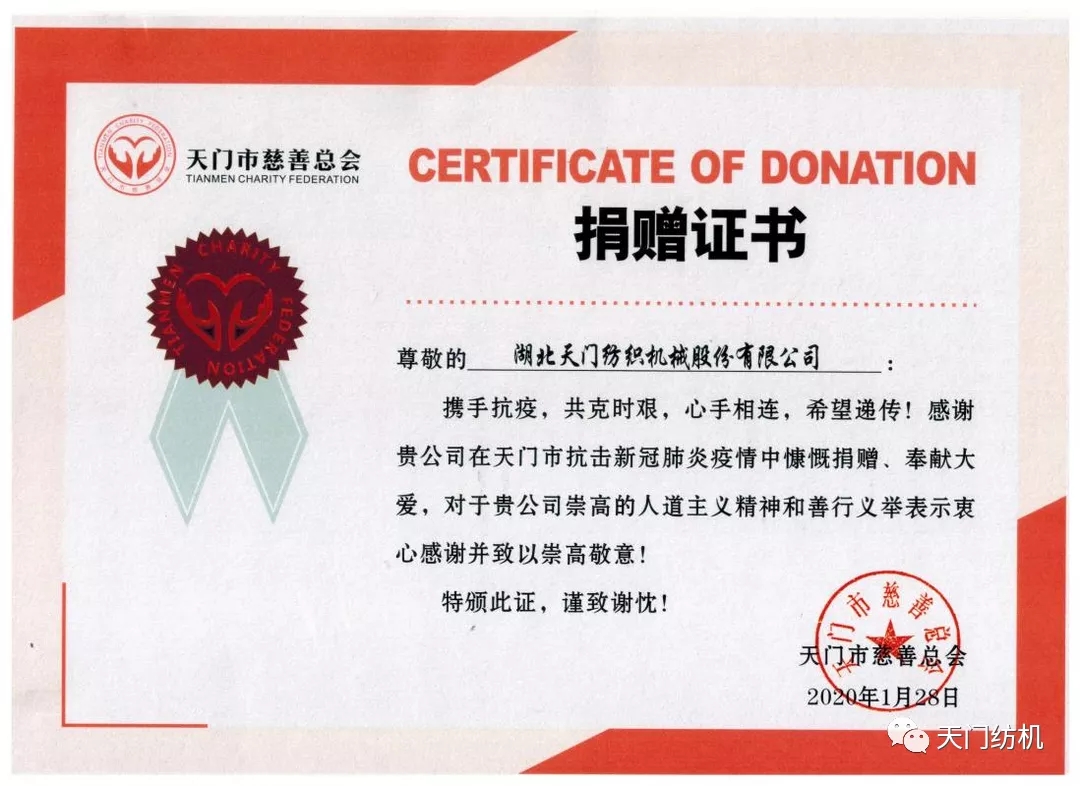 2020年,面對來勢洶洶的新冠疫情,作為一家民營企業(yè),天門紡機不計經(jīng)濟損失,率先提出了“不給黨和政府添麻煩,不給疫情防控添壓力,不給社會就業(yè)添負(fù)擔(dān)”,率先停產(chǎn)歇業(yè),率先捐贈100萬元,專門用于收治新冠患者,采購短缺醫(yī)療物資。公司管理層還通過多種渠道,主動與有影響力基金會取得聯(lián)絡(luò),分6個批次向醫(yī)院、社區(qū)捐贈了30萬只醫(yī)用口罩、10噸醫(yī)用消毒液、2萬件防護服等大量物資,在抗疫的危急時刻發(fā)揮了重要作用。