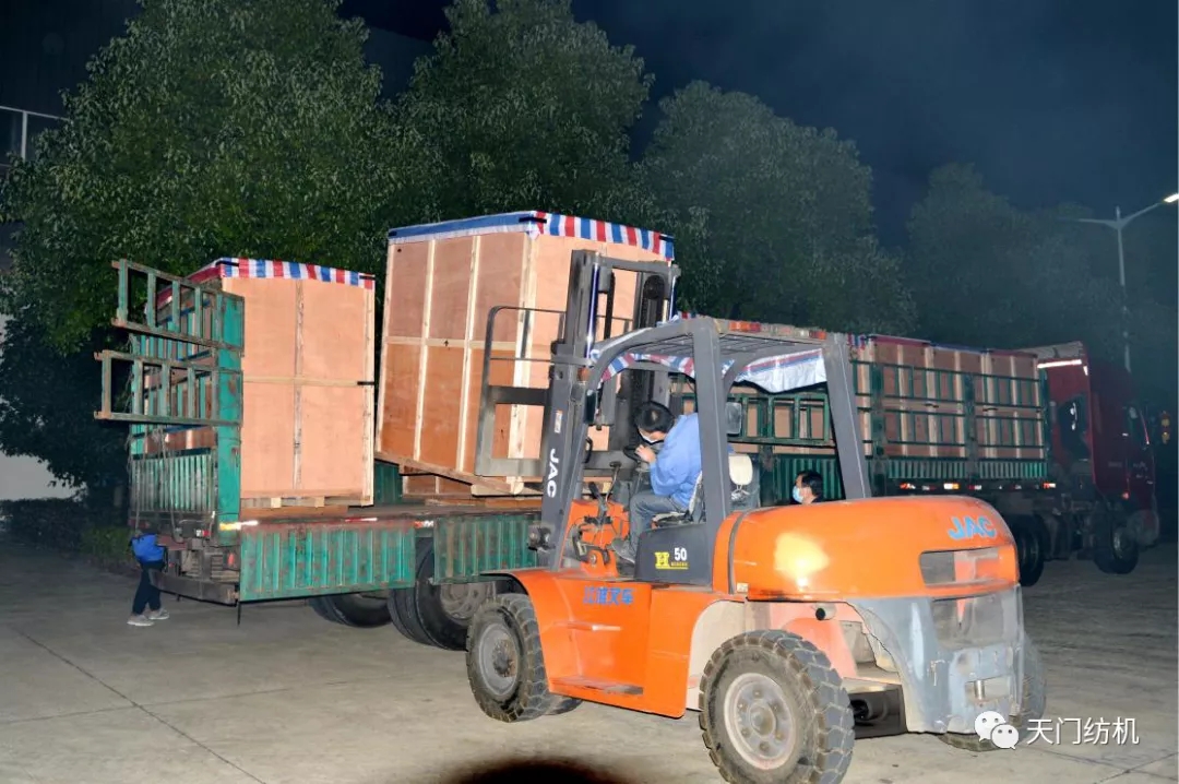 燈火闌珊處,機器轟鳴聲。已是臘月二十一的晚上,天下著冷冷細雨,神州大地處處已有年味,但在天門紡機廠區(qū)仍然一派繁忙景象:數萬平米的車間內全都燈火輝煌,工人們緊張有序的在工作;車間外,幾輛大貨車一字形排開,正在上貨發(fā)往淮北華孚和魯泰紡織。