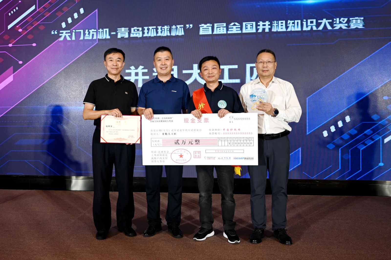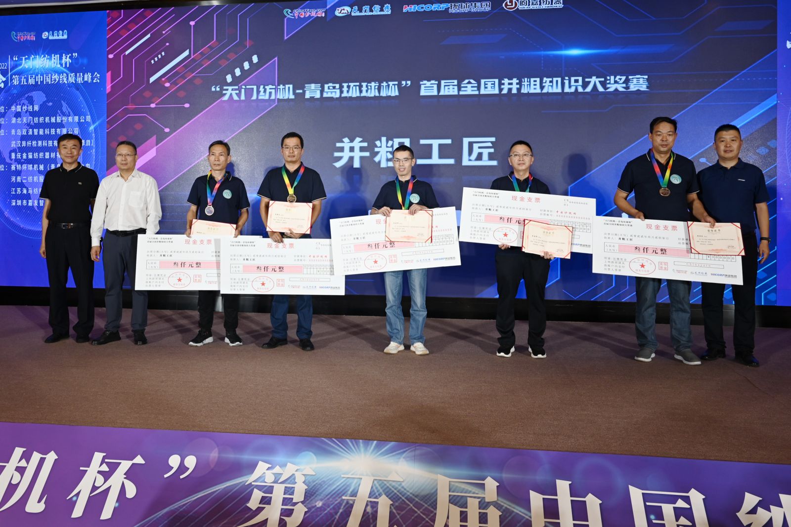 這是一場別開生面的競賽學(xué)習(xí)活動,6位選手的精彩表現(xiàn)不斷地贏得熱烈的掌聲,江蘇悅達(dá)馮傳軍以888分獲得“天門紡機(jī)-青島環(huán)球杯”首屆全國并粗知識大獎賽-爭霸賽冠軍,為歷時3個月的大賽活動劃上圓滿的句號?,F(xiàn)場爭霸賽結(jié)束后,隆重舉行了頒獎活動,現(xiàn)場頒發(fā)“企業(yè)優(yōu)秀組織獎”、“并粗工匠獎”、“并粗大工匠獎”。天門紡機(jī)副總經(jīng)理肖少華、賽特環(huán)球營銷總監(jiān)陳濤、中國紗線網(wǎng)總裁鞠彥軍為大賽活動致辭并頒獎。