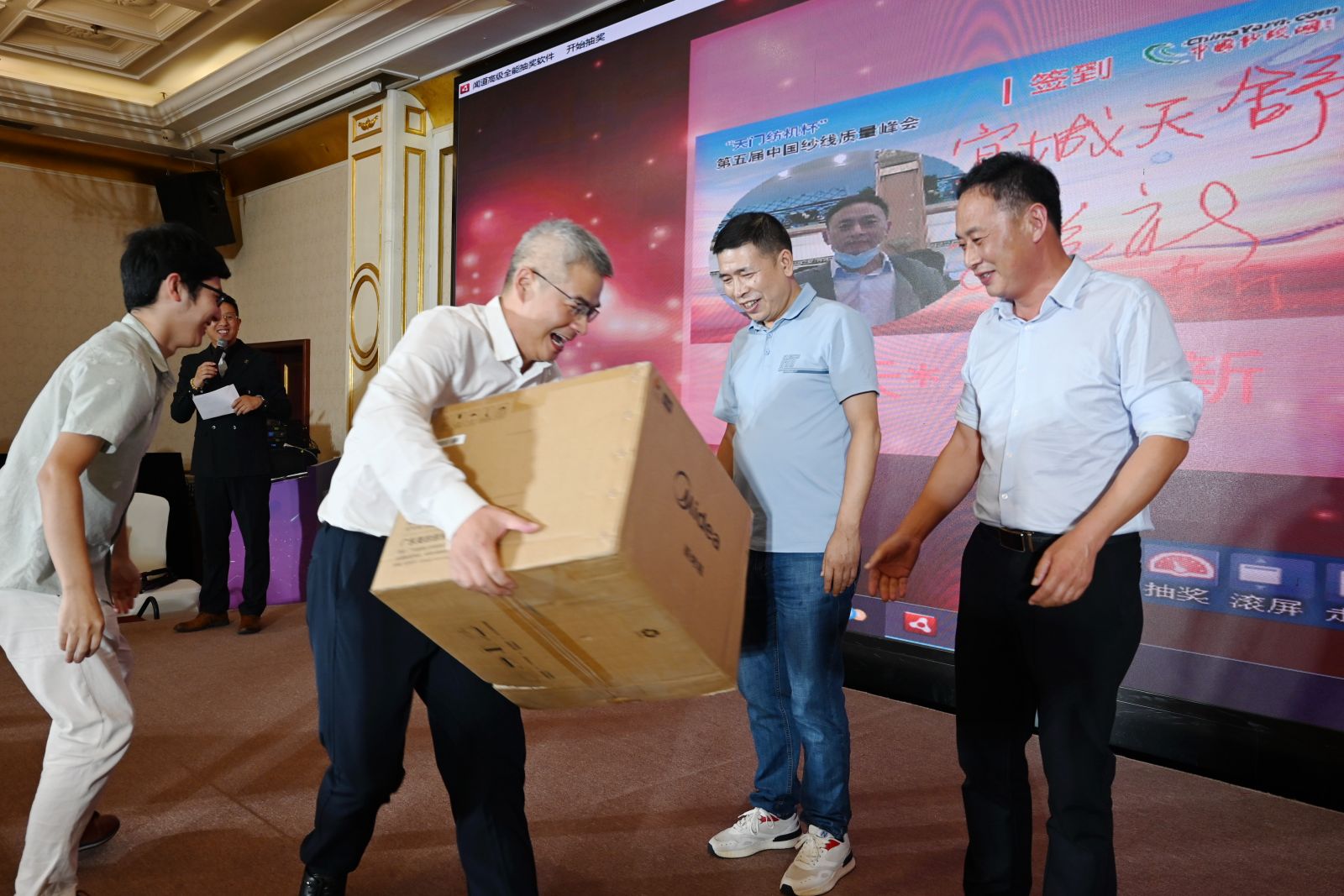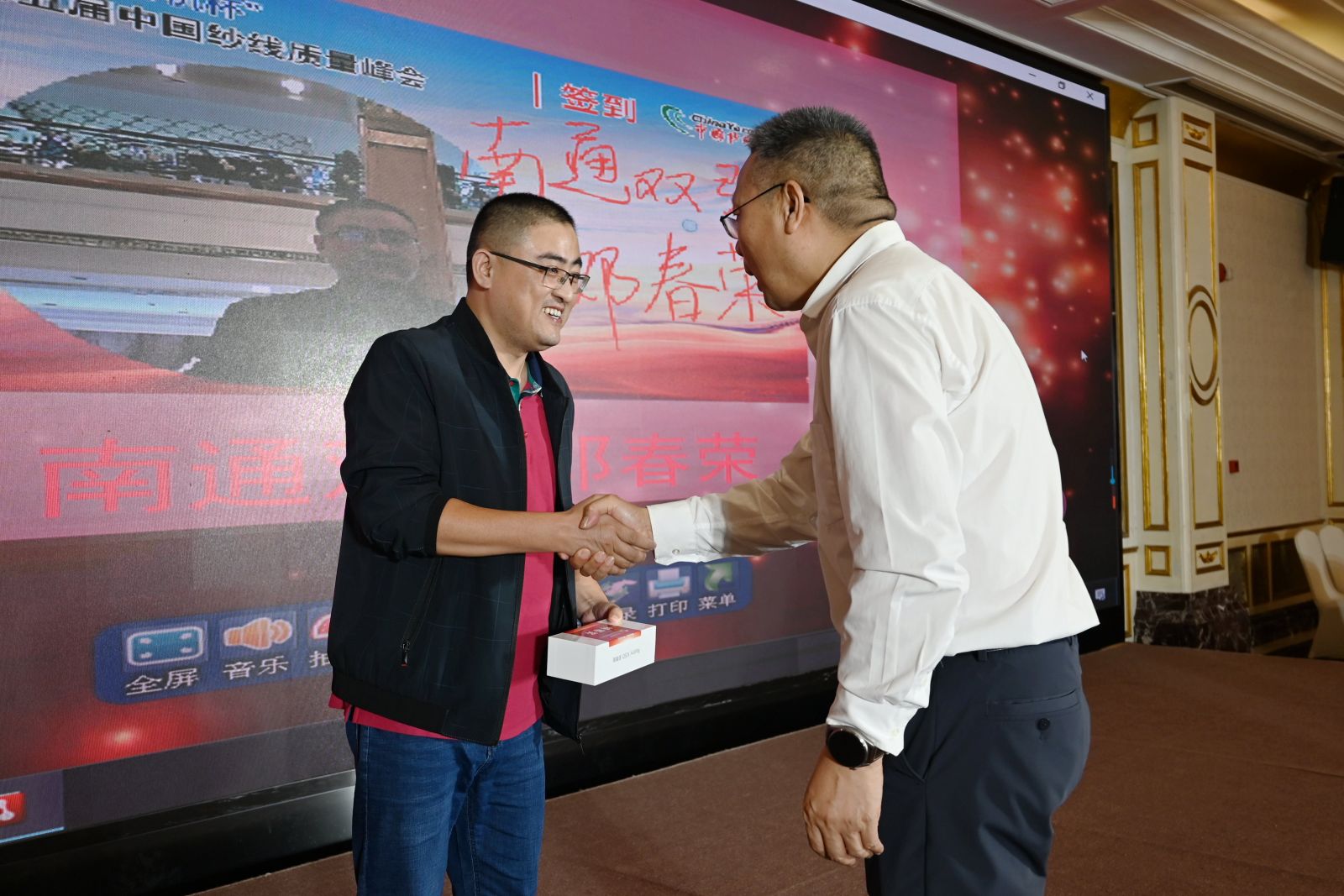 △天門紡機(jī)市場總監(jiān)周志宏、天門紡機(jī)副總經(jīng)理肖少華為抽獎環(huán)節(jié)獲獎代表頒獎