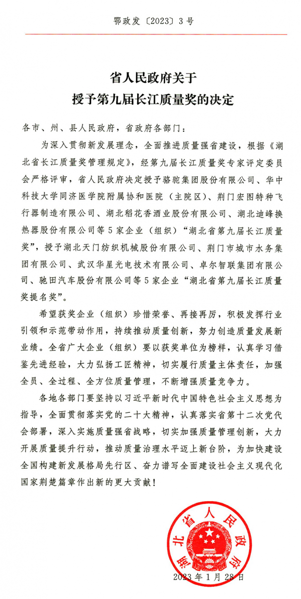 近日,湖北省人民政府以鄂政發(fā)(2023)3號(hào)文頒發(fā)《關(guān)于授予第九屆長(zhǎng)江質(zhì)量獎(jiǎng)的決定》。天門(mén)紡機(jī)榮獲“湖北省第九屆長(zhǎng)江質(zhì)量獎(jiǎng)提名獎(jiǎng)”,受到省政府表彰。