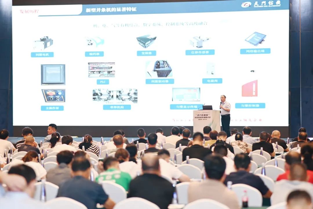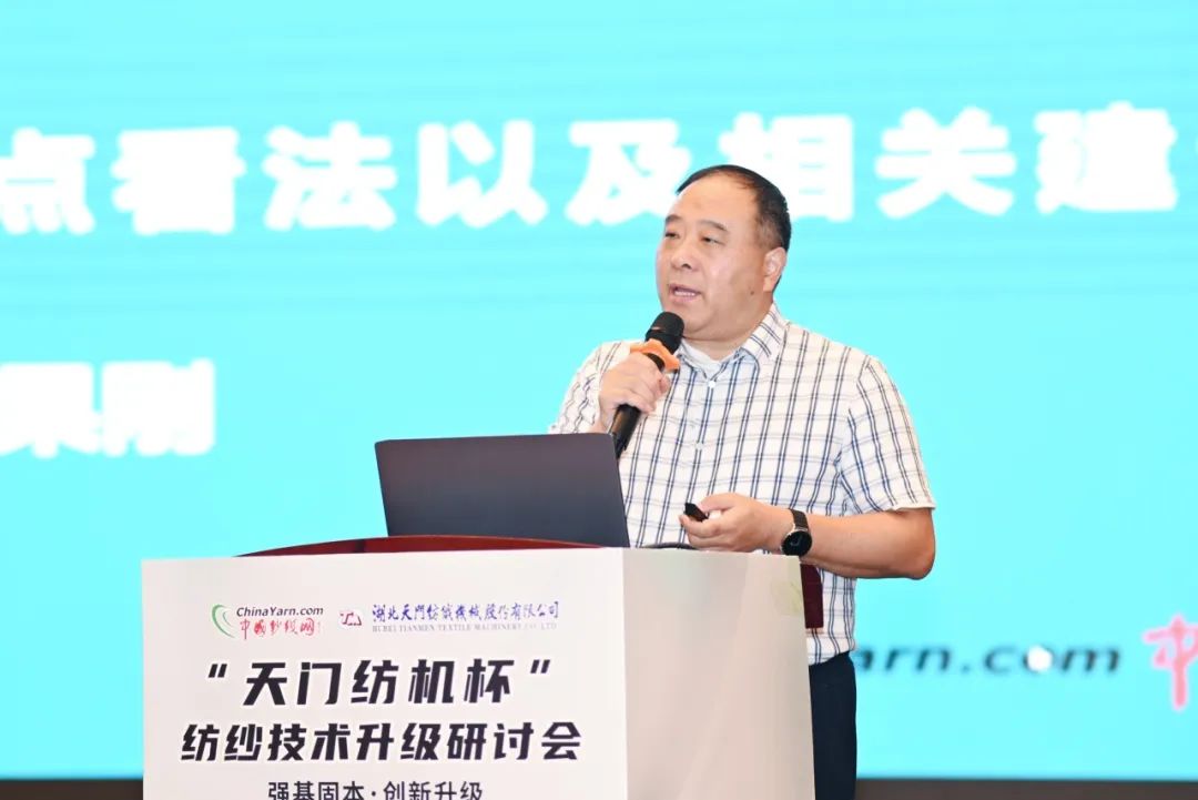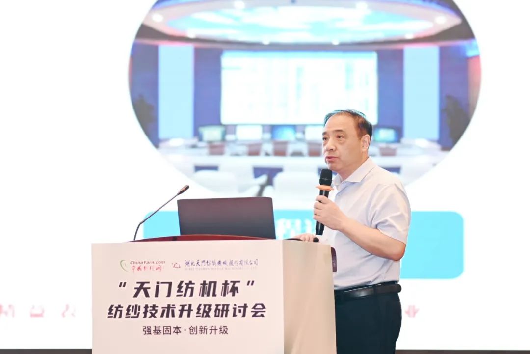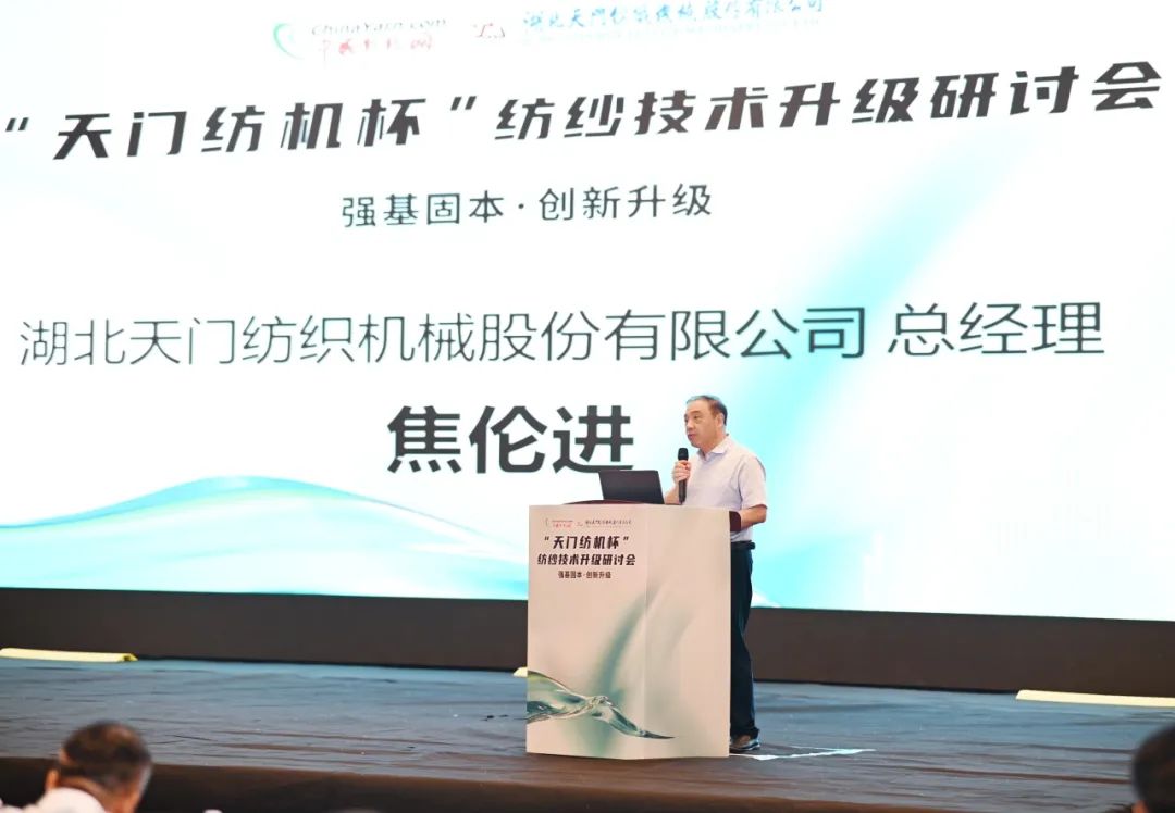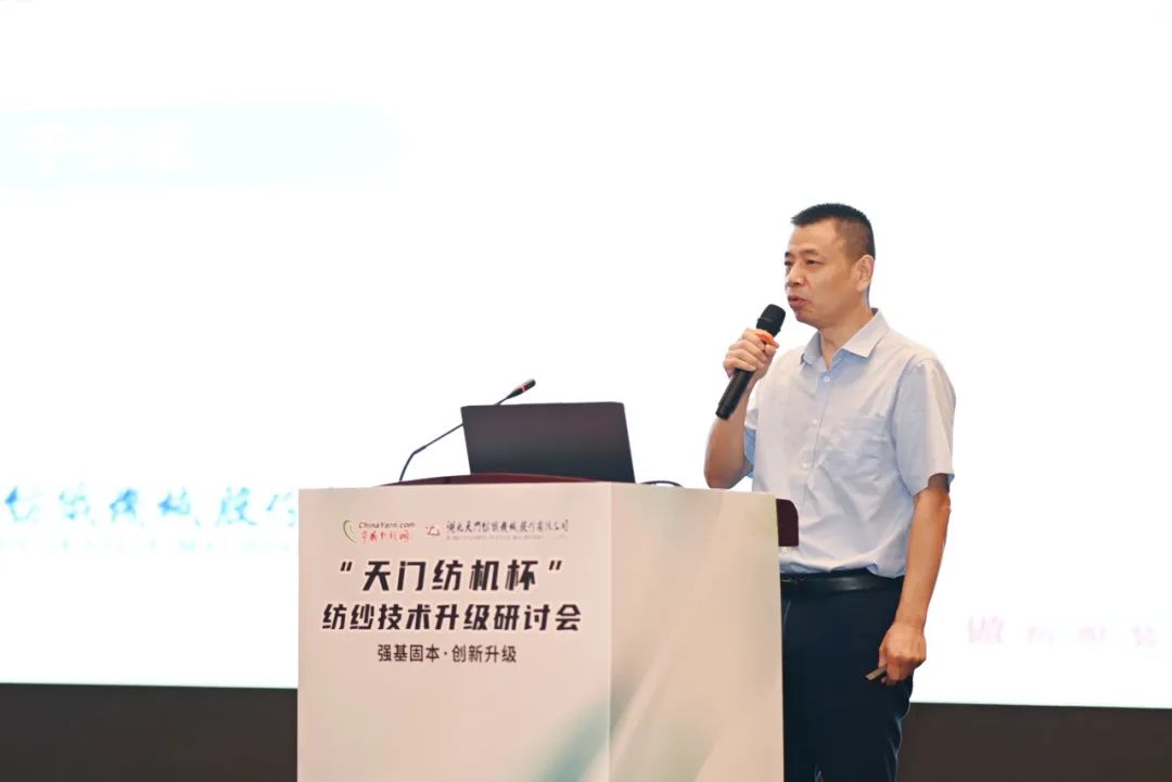 天門紡機總經(jīng)理焦倫進向蒞臨會議的領(lǐng)導(dǎo)、嘉賓及長期關(guān)心支持天門紡機發(fā)展的各界同仁朋友表達了誠摯的謝意,他表示,天門紡機“生產(chǎn)制造柔性化、倉儲物流自動化、信息管理現(xiàn)代化”的5G+智慧工廠項目正在不斷向前推進,我們將通過自身的數(shù)字化轉(zhuǎn)型與智能化改造,為紡織企業(yè)數(shù)字化轉(zhuǎn)型和智能化改造持續(xù)提供裝備基礎(chǔ)。并作了題為《并條機的創(chuàng)新與應(yīng)用助力紡企高質(zhì)量發(fā)展》的專題報告。他交流了天門紡機堅定不移走“專精特新”之路的工作經(jīng)驗,分享了勻整控制、在線監(jiān)控、5G+物聯(lián)網(wǎng)、自動熱交換降溫系統(tǒng)等技術(shù)創(chuàng)新成果。