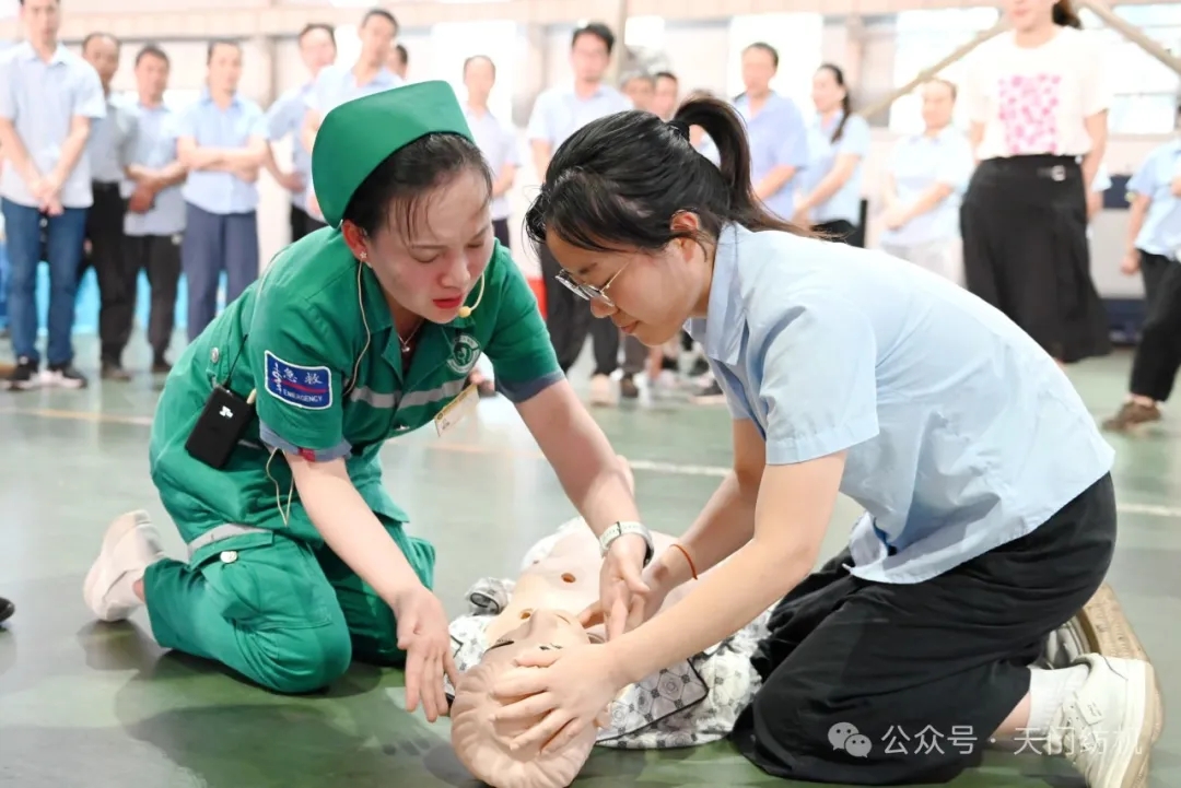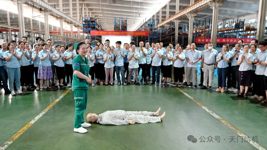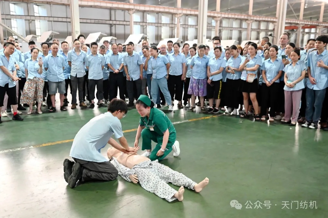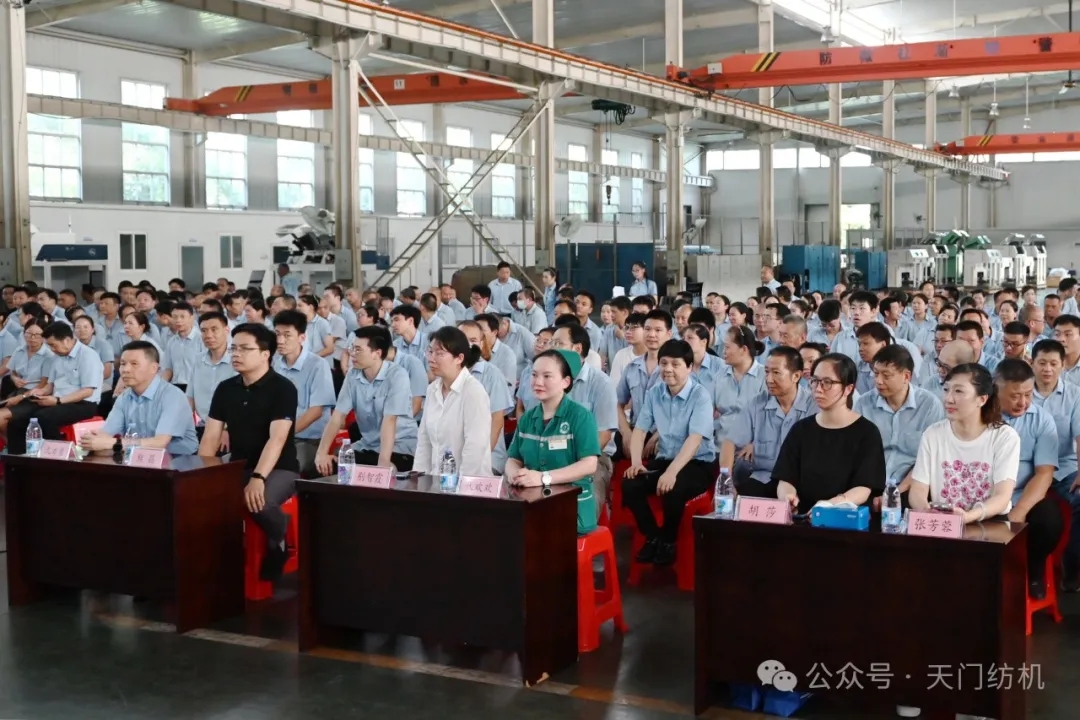 室外赤日炎炎,酷暑難當;室內(nèi)座無虛席,氣氛熱烈。2024年7月17日下午,天門紡機在生產(chǎn)現(xiàn)場組織了一場別開生面的健康知識及急救技能培訓活動,天門市第一人民醫(yī)院的多位醫(yī)療專家應邀來公司進行健康知識講座和急救實操演示。