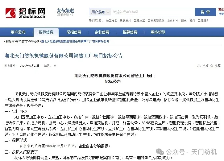 近日,天門紡機(jī)對(duì)外發(fā)布設(shè)備招標(biāo)公告,正式啟動(dòng)“智慧工廠”項(xiàng)目新一輪設(shè)備采購計(jì)劃。